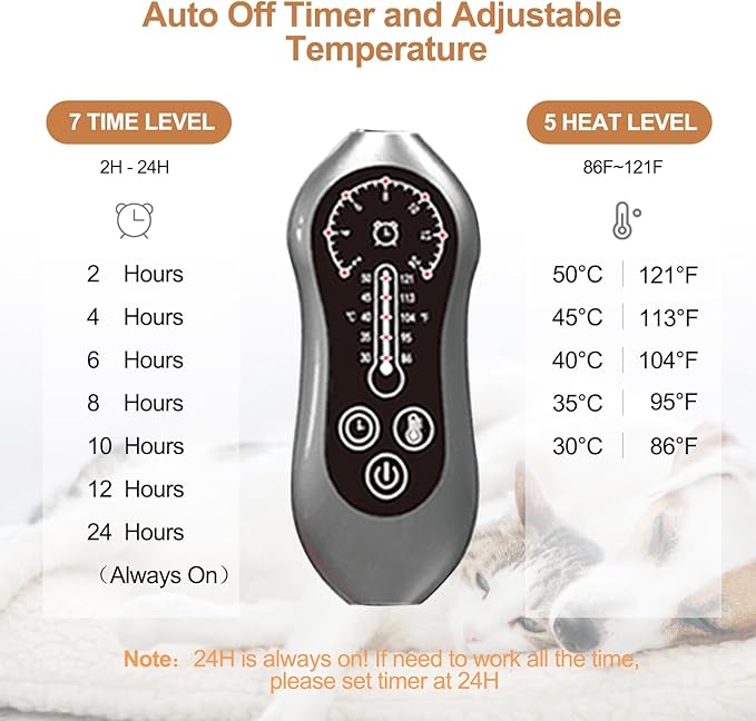 - 【Auto Off Function】The cat warming pad blanket provides 7 levels timer and auto off fuction, 2H,4H,6H,8H,10H,12H and 24H(always on) which covers a wider range of time frame each day. More timer choices makes the set flexible.Auto off fuction reduces the pain to plug and unplug everyday.