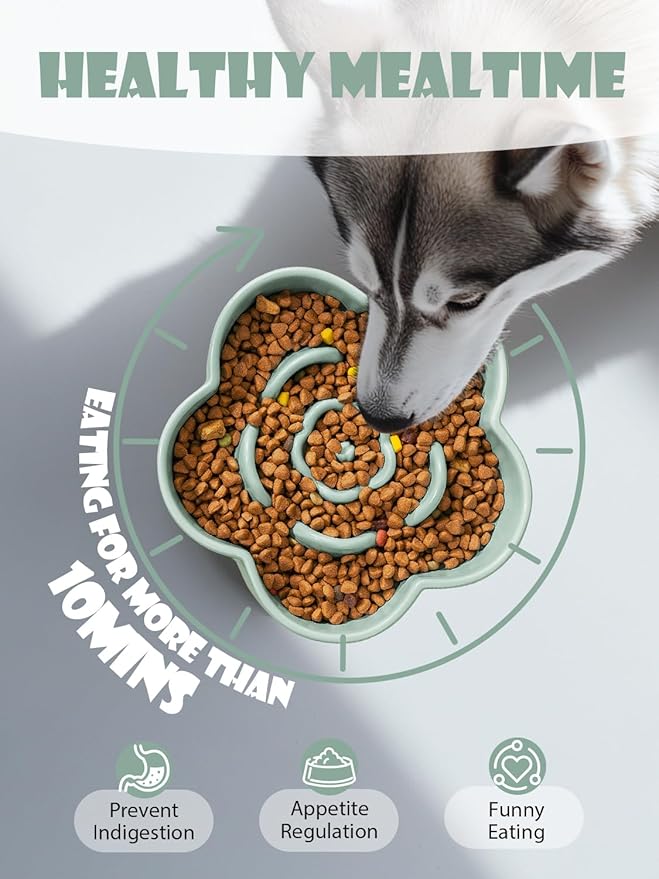 - Barrier Design: The slow feeder bowls feature an unique plum-shape puzzle design that allows pets to eat at a slower speed. It will help them to promote gastrointestinal digestion and avoid vomiting and overeating. Give puppyies and cats a funny eating and healthy mealtime
