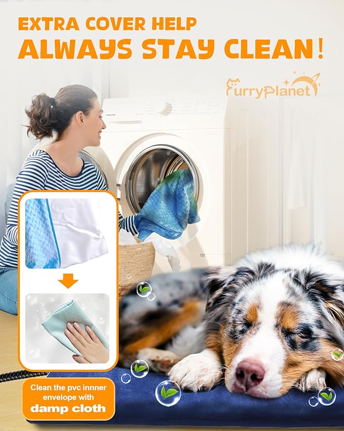 - 💯Extra Cover Help Always Stay Clean! : FurryPlanet Thoughtfully Offer Extra Replaceable Cloth Cover, which are made of Soft Crystal Velvet. Delicate pattern for added friction. When the old cloth cover is dirty, you can take it to the machine for washing. And won't worry that the heating pad can't work in the meantime, keeping your pet warm forever. Plaese clean the pvc innner envelope with damp cloth only.