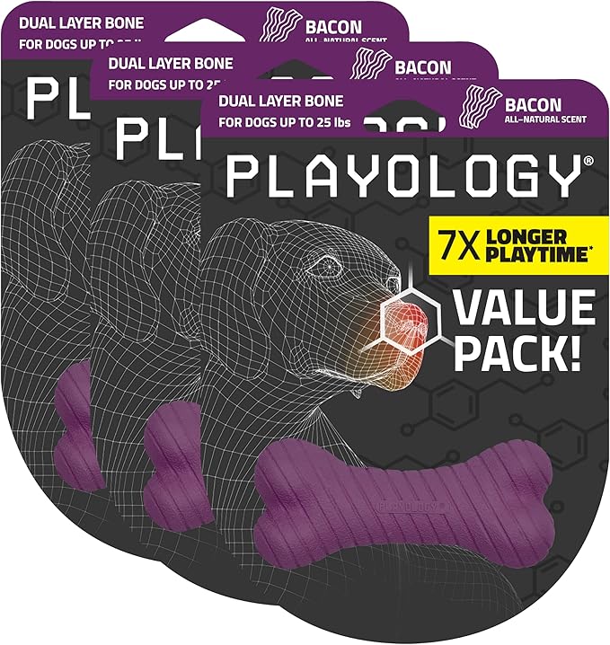 - Playology's Dual Layer Bone: These dog chew toys feature a special 2-layer design to withstand tough chewers and keep them entertained. Made with an exciting Bacon scent and Purple color these are great dog toys to keep them busy.