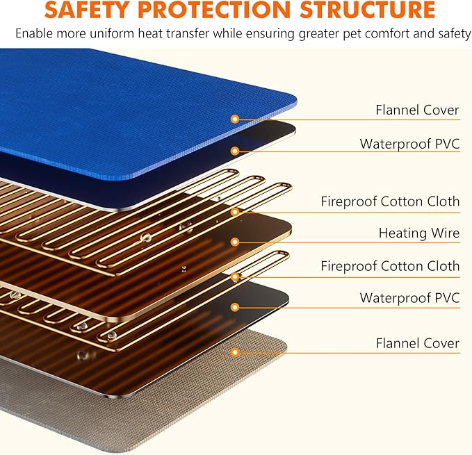- SAFETY & SECURE STRUCTURE : MET Certified for peace of mind. The cat heating pad indoor features a multi-layer protective structure with thickened soft PVC outer shells, built-in fire-resistant cotton materials, and fully sealed technology. This cat heated pad is equipped with waterproof, power leak-proof, and fire-resistant functions to protect your pets from burns.