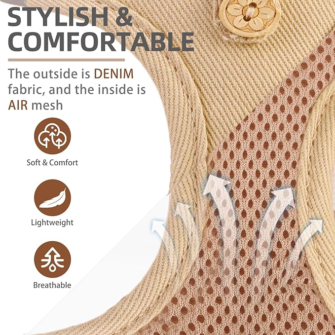 - [LIGHTWEIGH AND BREATHABLE] - The harness is made of quality polyester and air mesh fabric, your dog will not feel stuffy when wearing it, which keeps fur dry and comfortable. Besides, this harness is very lightweight so the dog will hardly feel the burden. Perfect for getting your furry kid dressed to go out and play.