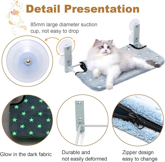 - Cordless Cat Hammock: Allowing your cat to jump freely without being bound, and without worrying about tripping over ropes. The 20 x 12 inch glow in the dark cat window perch cat hammock has ample space and comes with a zipper for easy disassembly and machine washing.