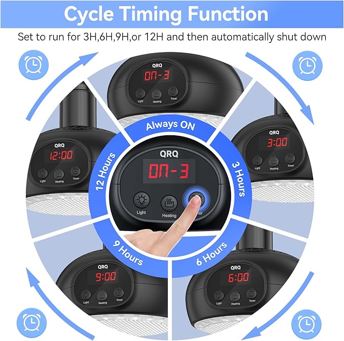 - 💡【5-Level Timing Function】QRQ chicken coop heater lamp has a built-in timing function. According to the ambient temperature of the chicken house, you can choose 3H-6H-9H-12H-always on timing mode, flexibly adjust the use time of the heater, and improve the convenience and comfort of use. Make your breeding business more comfortable and scientific.