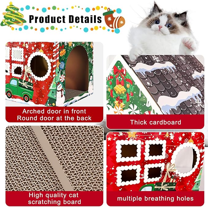 - Cardboard cat house: Cat Christmas house is made of cardboard, sturdy and stable enough to withstand your cat's daily use. Cat cardboard house is easy to assemble, with snap-on cardboard, you can have a exquisite and comfortable cat house in a few minutes