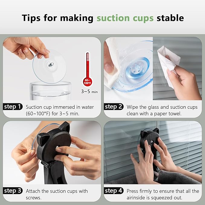 - Product Care Instructions : About suction cup: we need to soak the suction cup in hot water to soften it, exhaust all gas, clean the window, and then attach the suction cup to the window. Let it sit for 24 hours before letting the cat go up, otherwise the suction cup may not be able to attach to the window due to internal gas and water stains. About suction cup: we need to soak the suction cup in hot water to soften it, exhaust all gas, clean the window, and then attach the suction cup to… See more