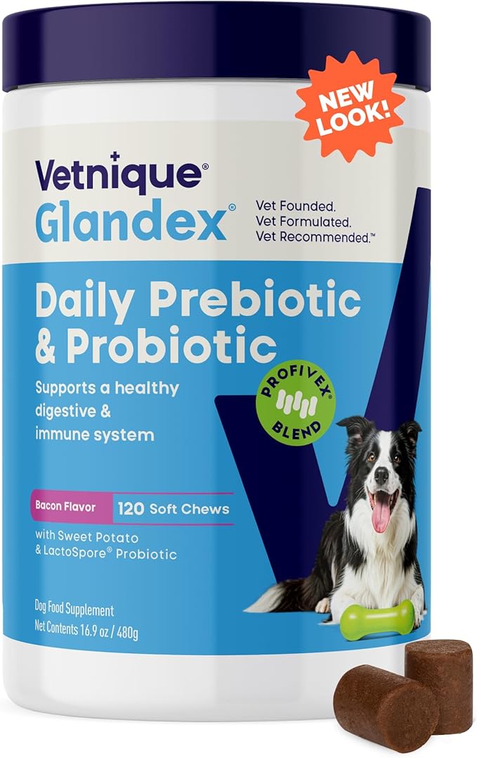 - GLANDEX FOR DOGS PROBIOTICS - Each tasty, Glandex Daily Probiotic for Dogs Bacon-flavored probiotic dog chew supports daily immune function with a blend of anti-inflammatory digestive enzymes which support digestive health.