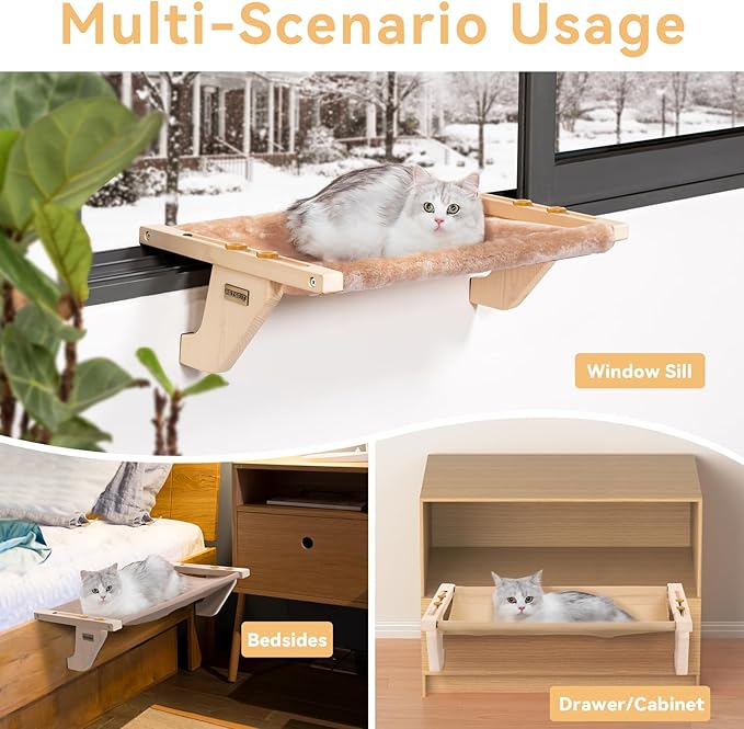 - No Drilling&Quick Assembly:Our cat window perch design is more stable&safe,by two extensible metal hooks fixed on the carrier,and supported by two wooden brackets,can adjust the appropriate width freely,well protect the window from concentrated force damage,also do not need to worry about falling off,this cat bed for window is widely used in doors,drawers,Windows,table partitions