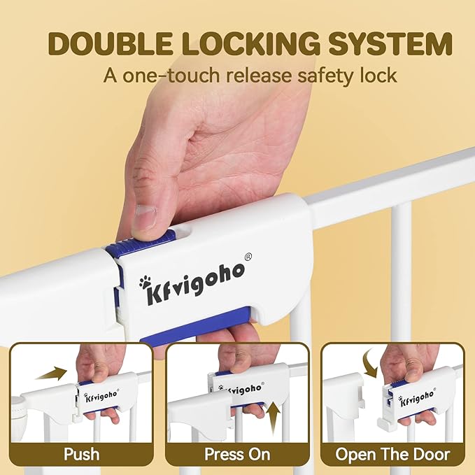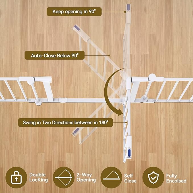 - Ultimate Convenience & Safety: The Dog Gate has an Auto-Close Door and a one-touch release safety lock, the door can be swung in two directions between 180°.Keep opening in 90° and auto-close Below 90°. The gate also has a double locking system to ensure that pets move in your planned tend.