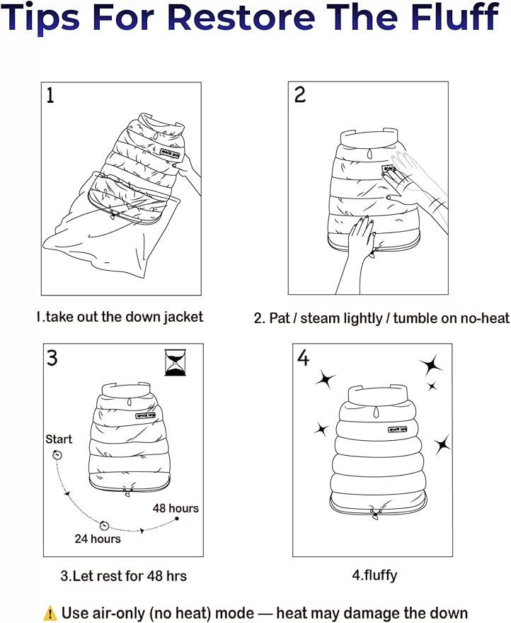 - 【Care & Long-Lasting Performance】For minor stains, we recommend spot cleaning and air drying. For more significant stains, rinse with water and tumble dry on a no-heat setting. Improper cleaning may affect the shape and texture of the down fill. For best results, take it to a professional dry cleaner if needed.