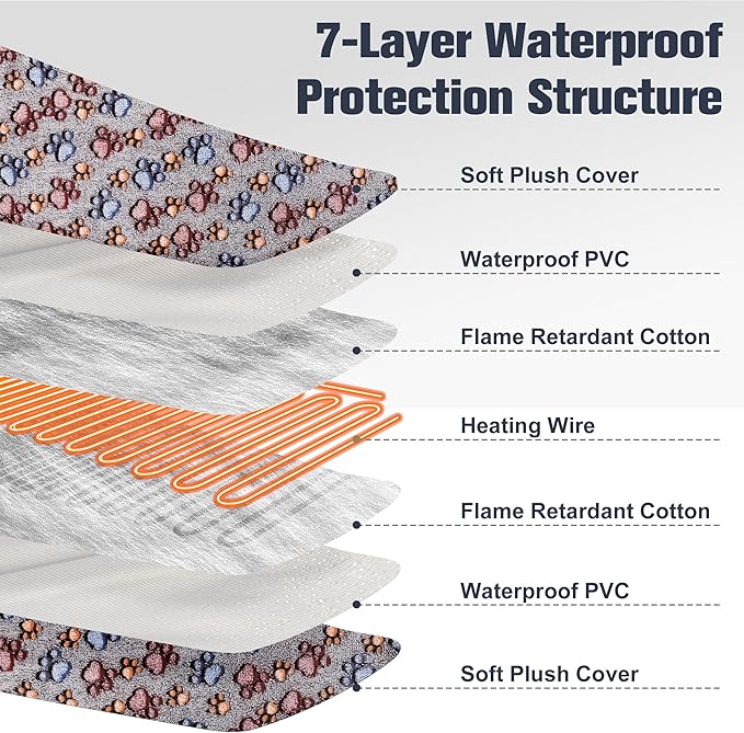 • 7-Waterproof Layer Protection Structure: Our Cat warm bed mat features a 7-layer protection structure, ensuring the safety and security of your beloved pets. with MET-certified heating wire protect pets from burns. The PVC inner with waterproof and flame-retardant function