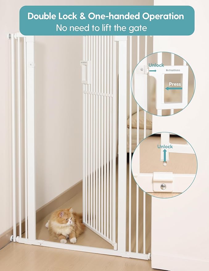 - DUAL LOCK SAFETY DESIGN: The double-lock mechanism allows for easy, one-handed operation to open the gate without lifting—ideal for elderly users. It is equipped with an auto-close function, and the hold-open feature keeps the gate open when positioned beyond 90°, allowing for easy passage through extra-tall gate