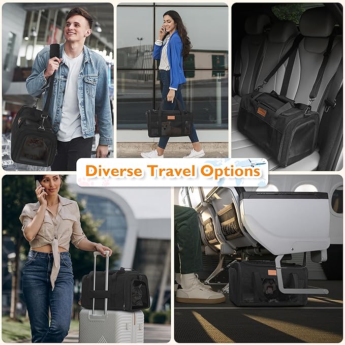 PETUX Cat Travel Carrier with Litter Box - 17"x11"x9.5", TSA Airline Approved, Underseat, Soft Sided Pet Carrier for Small Cats Under 12 lb with Safety Zipper, Anti-Scratch Mesh - Black