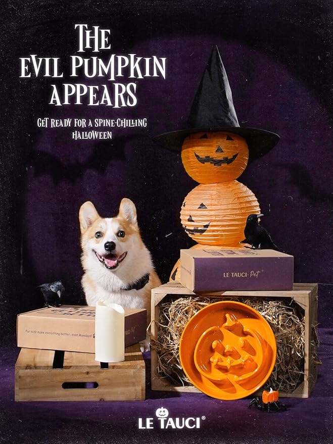 LE TAUCI Ceramic Puzzle Feeder Bowl Raised 1.5 Cup with Wood Stand for Small Medium Dog & Puppy, Fast Eating Food Dish,Pumpkin Orange