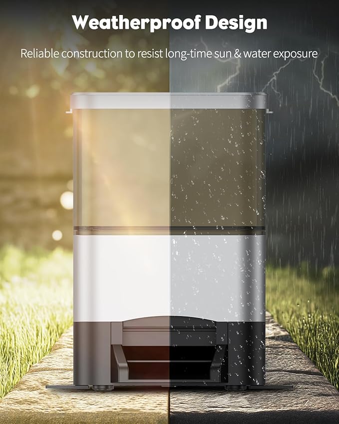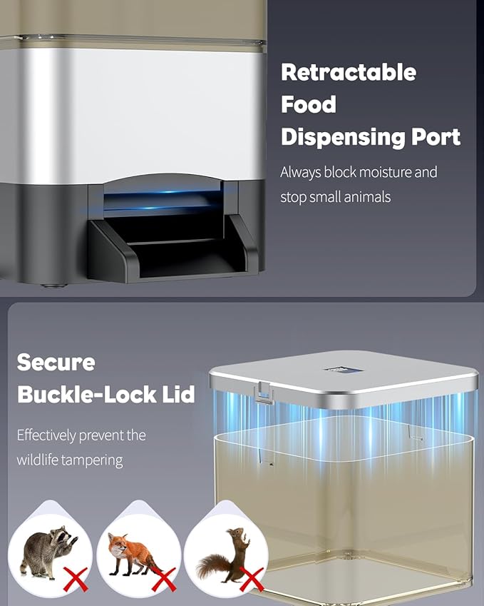 - Weatherproof Design: Reliable ABS and PC construction resists long-time sun and water exposure. Retractable food dispensing port effectively prevents moisture intrusion and deters small animals. The desiccant bag and protective weather cover always maintain food freshness