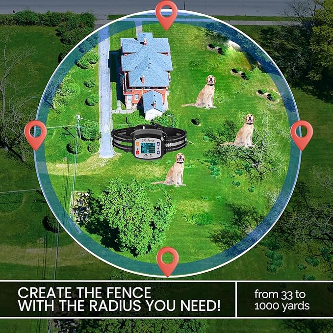- 2.This PORTABLE (Take it anywhere) electric dog fence wireless system can cover large OUTDOOR areas up to 2187 Yards radius and up to Max 0f 3103 Acres allowing you to use for OUTDOOR use only. Please note This collar is most suitable for open field areas or farms Not Suitable for very small yards. Min 66Ft Radius. Set it up once and latest model has full Memory Function, no need for daily setup but weekly reprogram is recommended due to GPS Drift