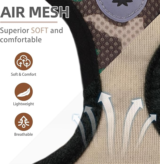 - COMFORTABLE MATERIAL, DAILY WALKING, FOUR SEASONS WEARING: - The harness is made of durable polyester, and it's adopted with an air-mesh design. The whole harness is very soft, lightweight, and breathable. Even if your dog wears it all day, he won't feel any discomfort. For daily walking or running, it is a very easy thing to do. Besides, this is a four seasons harness, it keeps the dog cool on hot days and keeps the dog warm on cold days