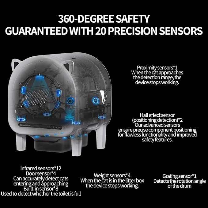 - 【KEEP YOUR CAT 100% SAFE】 Our self cleaning cat litter box includes 12pcs of infrared sensors & 2pcs of hall effect sensors and 1pcs proximity sensors to monitor your cat's presence accurately. This automatic cat litter box self cleaning keeps the opening accessible to avoid pinch points or ""scissor angles."" It stops the cleaning process if a cat jumps in during the self-cleaning cycle, ensuring a secure environment