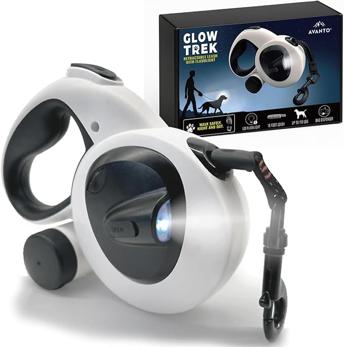 AVANTO Retractable Dog Leash with Flashlight, 16ft Heavy Duty LED Night Safety Leash for Dogs up to 110lbs – 360° Tangle-Free, USB Rechargeable Light, Waste Bag Dispenser, One-Hand Brake & Lock