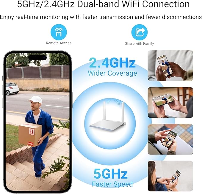 - 【5GHz/2.4GHz Dual-Band WiFi, Faster Connection】The wireless security camera outdoor stands out with its dual-band WiFi compatibility.While 2.4GHz offers extended range, 5GHz delivers lightning-fast speeds for seamless streaming and real-time alerts. Enjoy a more stable and responsive experience whether you're home or away