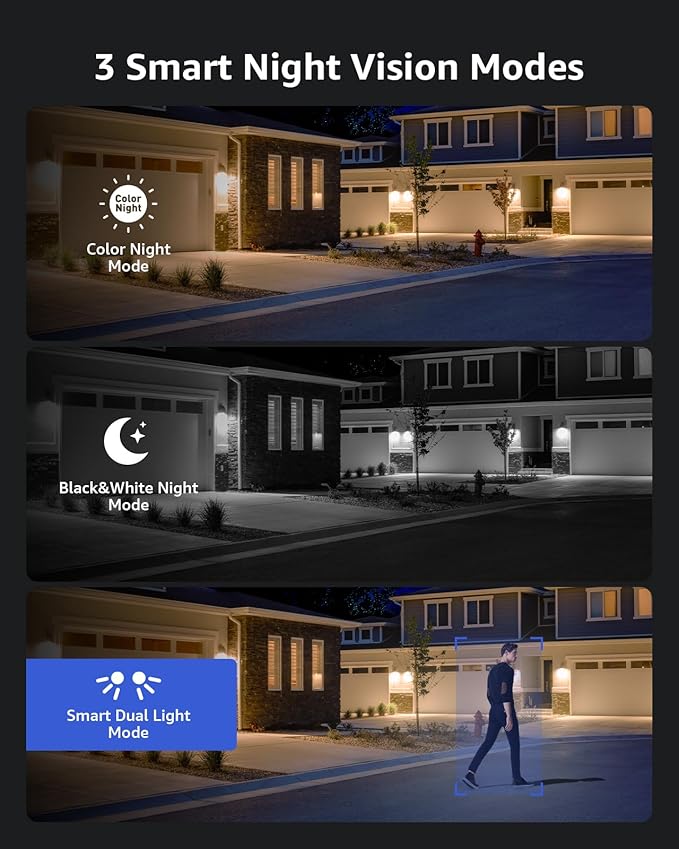 - From Black&White to Colored Night Vision: With the default smart dual light, human motion triggered and auto-turned the vision into color. This home camera also can switch to just IR night vision or white light night vision, 3 night vision ways for you to choose flexibly
