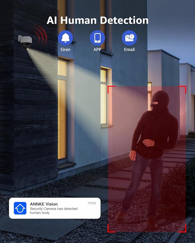 - AI Human Detection for Precise: You can receive prompt notifications when the outdoor cameras a detects human motion, which significantly improves detection accuracy and reduces false alerts caused by moth, light, or other factors.Besides, it can triggers an alarm sound