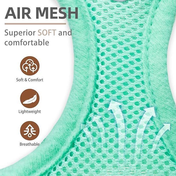 - COMFORTABLE MATERIAL, DAILY WALKING, FOUR SEASONS WEARING: The harness is made of durable polyester, and it's adopted with an air-mesh design. The whole harness is very soft, lightweight, and breathable. Even if your dog wears it all day, he won't feel any discomfort. For daily walking or running, it is a very easy thing to do. Besides, this is a four seasons harness, it keeps the dog cool on hot days and keeps the dog warm on cold days
