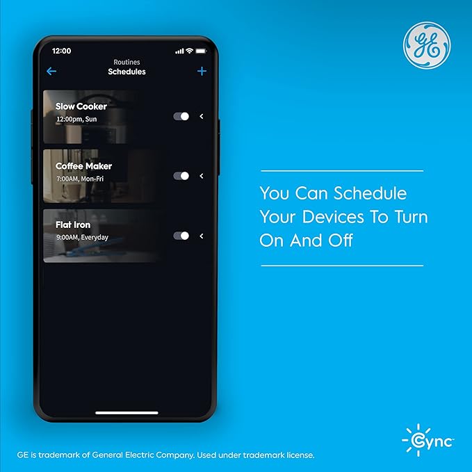 - Set Schedules: Simply plug in electric devices to smart outlet and use the Cync app to schedule your fan to turn on before you arrive, turn off your curling iron from your phone or turn on holiday lights at night