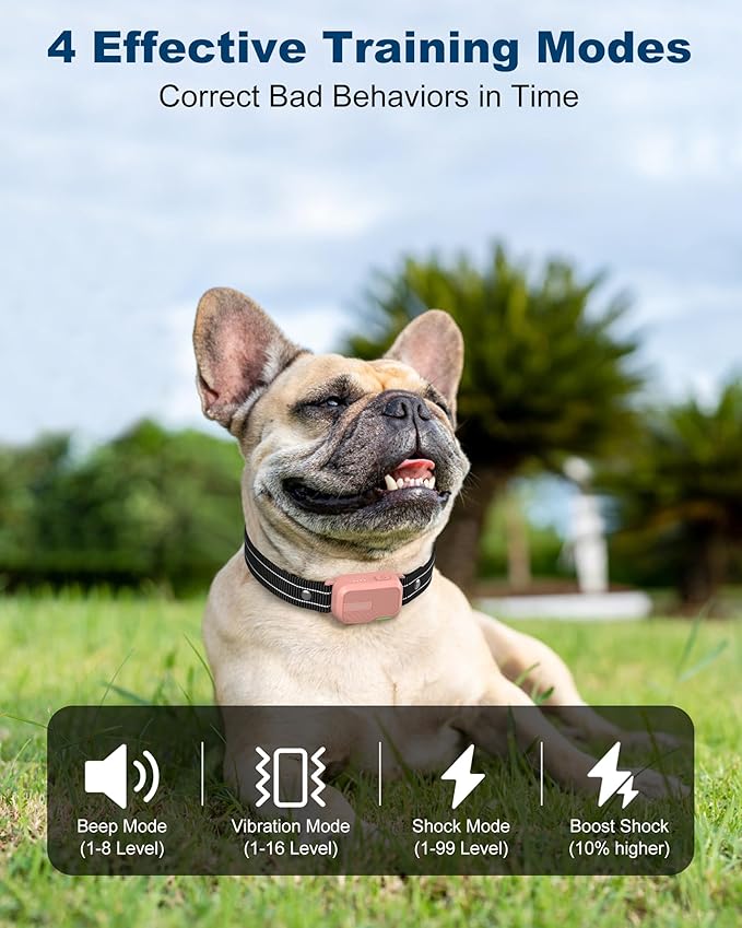 - 【4 Humanized, Effective, Safe Training Modes】Our dog shock collar features 4 humane training modes: beep(1-8 levels), vibration(1-16 levels), safe shock(1-99 levels) and Shock Boost(10% higher). Enables you to set the right stimulation levels for your pet, which is helpful in deterring dogs from undesirable habits.