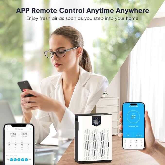 - 【𝐒𝐦𝐚𝐫𝐭 𝐂𝐨𝐧𝐭𝐫𝐨𝐥 𝐟𝐨𝐫 𝐀𝐧𝐲𝐭𝐢𝐦𝐞, 𝐀𝐧𝐲𝐰𝐡𝐞𝐫𝐞】Remotely master your air purifier via our Smart Home Life app, compatible with 2.4GHz Wi-Fi, for control unhindered by time or distance. Monitor your indoor air quality in real-time, turning off/on, changing modes or fan speed, creating a schedule, using a timer, track filter usage, and reorder replacements filter. Start it when you get off work and enjoy fresh air as soon as you get home