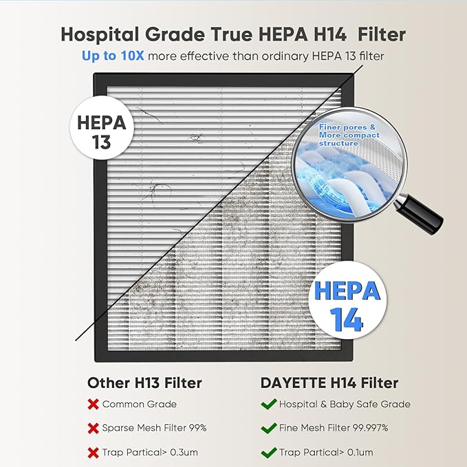 - 【𝐏𝐨𝐰𝐞𝐫𝐟𝐮𝐥 𝐇𝟏𝟒 𝐇𝐄𝐏𝐀 𝐅𝐢𝐥𝐭𝐞𝐫】Our New Air Purifiers upgraded to the H14 HEPA filter, which can capture 99.997% of particles as small as 0.1 micron, more efficient and powerful than H13, combined with pre-filter, H14 HEPA filter, activated carbon filter and net filter to achieve the highest performance, such as dust, smoke, pollen, hair and odor. You can enjoy a fresher, cleaner air environment and breathe easier