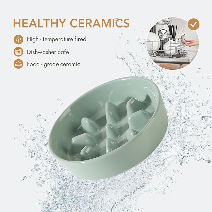 Ceramic 1.2 Cup Dog Bowl Slow Feeder, 7.3 inch Slow Pet Food Dish for Medium and Small Dog, Stop Bloat, Preventing Choking(Single Bowl, Light Green)