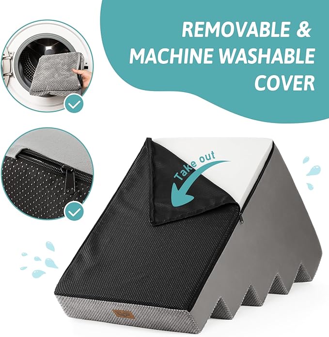 - Non-Slip Base and Removable Cover: Our dog steps for beds are equipped with a non-slip base featuring rubber dots for extra grip, minimizing movement during use. The pet steps cover is waterproof inner side, so you don’t have to worry about stains seeping into the foam. The outer cover is removable and machine washable for easy cleaning
