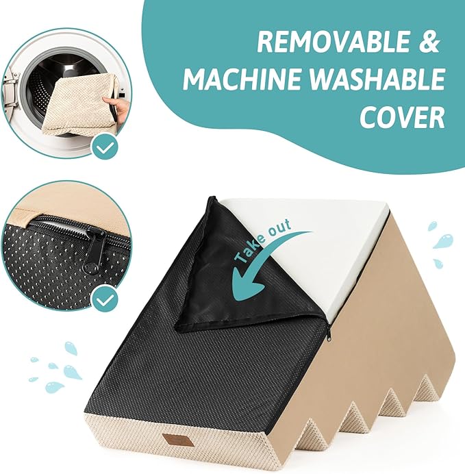 - Non-Slip Base and Removable Cover: Our dog steps for beds are equipped with a non-slip base featuring rubber dots for extra grip, minimizing movement during use. The pet steps cover is waterproof inner side, so you don’t have to worry about stains seeping into the foam. The outer cover is removable and machine washable for easy cleaning