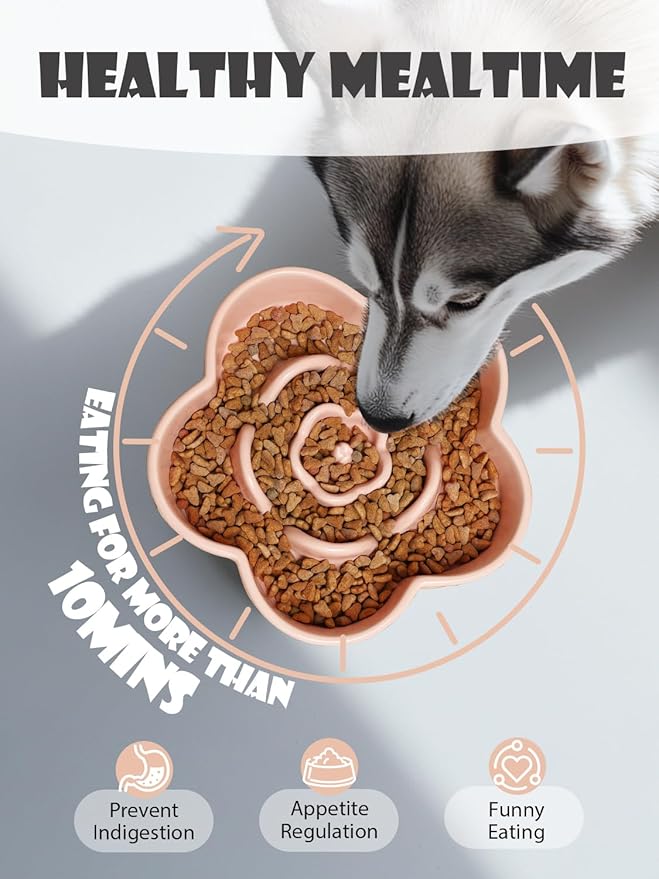 - Barrier Design: The slow feeder bowls feature an unique plum-shape puzzle design that allows pets to eat at a slower speed. It will help them to promote gastrointestinal digestion and avoid vomiting and overeating. Give puppyies and cats a funny eating and healthy mealtime