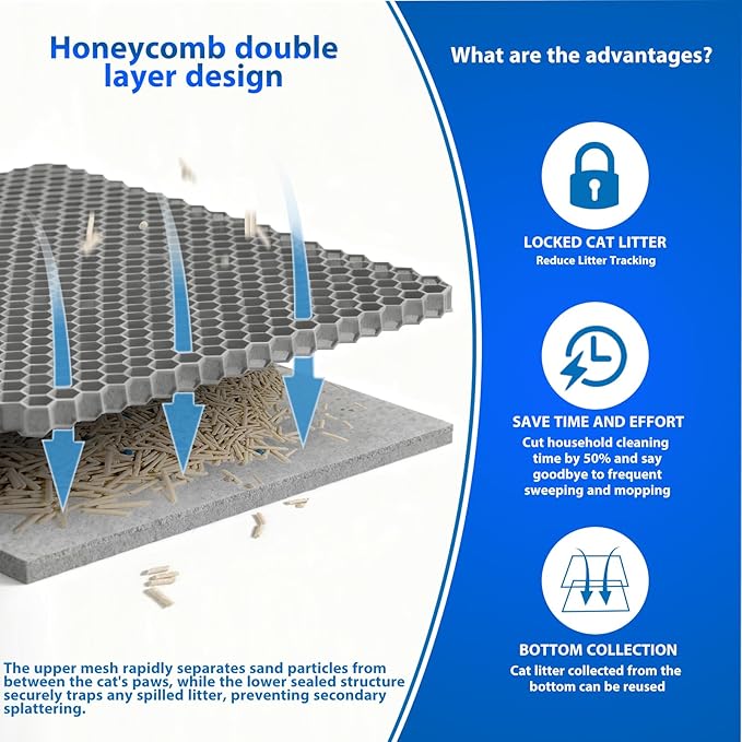 - Double Layer Honeycomb Structure:Traps Litter Like a Pro!Say goodbye to messy floors! Our dual-layer honeycomb grid acts like a high-tech filter, catching even the tiniest granules of litter as your cat steps out. The top layer sifts debris, while the bottom waterproof base locks in moisture.