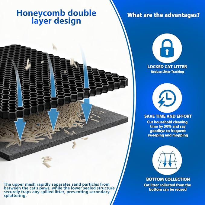 - Double Layer Honeycomb Structure:Traps Litter Like a Pro!Say goodbye to messy floors! Our dual-layer honeycomb grid acts like a high-tech filter, catching even the tiniest granules of litter as your cat steps out. The top layer sifts debris, while the bottom waterproof base locks in moisture.