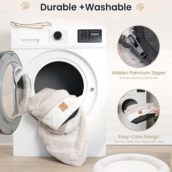 - Premium Zipper & Dual-Surface Cover – Easy Wash & All-Season Design - Durable premium zipper allows low-load washing and easy maintenance. Dual-surface cover combines plush fur and cooling silk fabric, creating a cozy dog bed and bed for cats that’s ideal for every size and season.