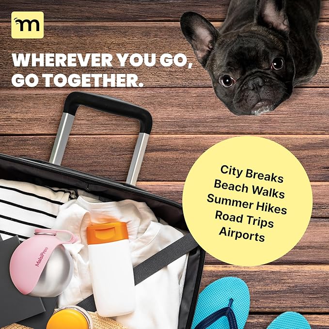 - Sleek & Smart: Our water bottle for dogs on the go has a unique round shape, brushed steel finish & a matte bowl. To pour our travel water bottle for dogs, open the lid and tilt the water into the bowl, then gently tilt back up to let water back in