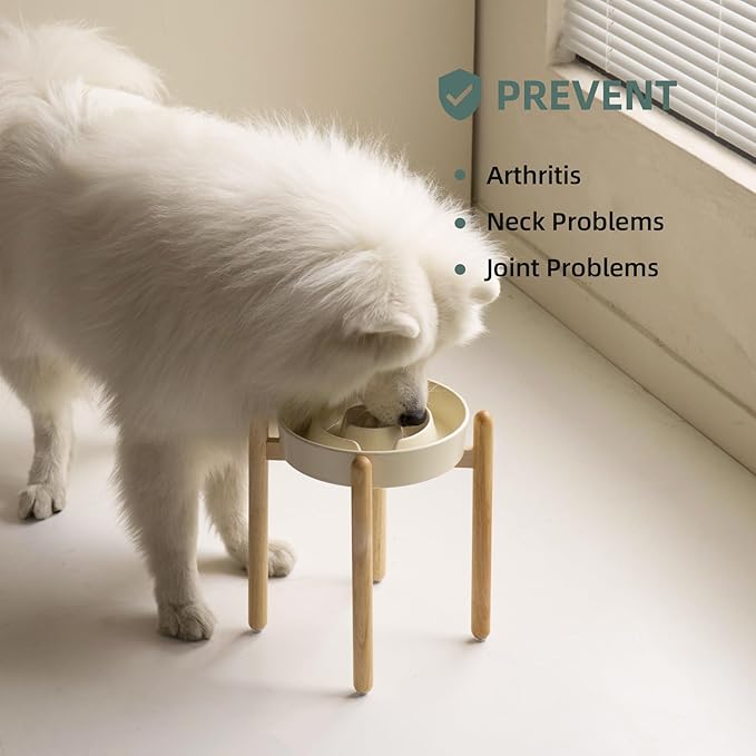 Ceramic 3.2 Cup Raised Slow Feeder Dog Bowl Set, Elevated Bowl with Wooden Stand for Large Dog, 9.5inch Puzzle Slow Pet Food Dish, Anti-Gulping(Beige, Single Bowl+ Stand)