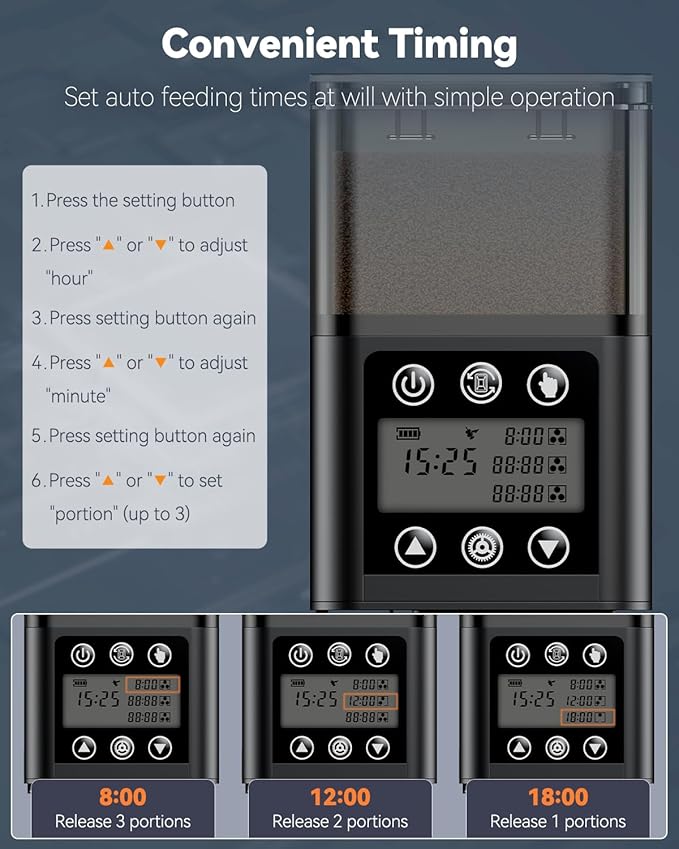 - Automatic Fish Feeder: Professional fish feeder with timer automatically dispenses food every day or at intervals (up to 4 days). It feeds fish up to 3 times a day (up to 3 portions each time). Just set auto-feeding times at will or release food manually