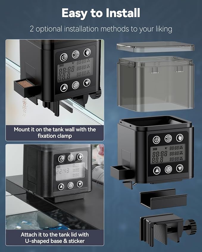 - Efficient & Handy: Driven by 2 AAA batteries, the aquarium fish feeder can last 1 to 3 months. 2 selectable installation methods – simply mount it on the tank wall with the fixation clamp, or attach it to the tank lid with the U-shaped base and sticker