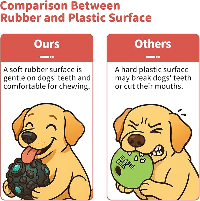 - Teeth Cleaning for Large Dogs - The outer rubber surface is durable yet remains soft and gentle on dogs' teeth and comfortable for chewing. By comparison, some popular squeaky balls use hard plastic surfaces, which may break dogs' teeth or cut their mouths. Our squeaky ball features meteorite-shaped nubs on its rubber surface, designed to help clean teeth and remove food stuck. You can also apply toothpaste on the JoyBruko dog ball to help furries keep dental health!