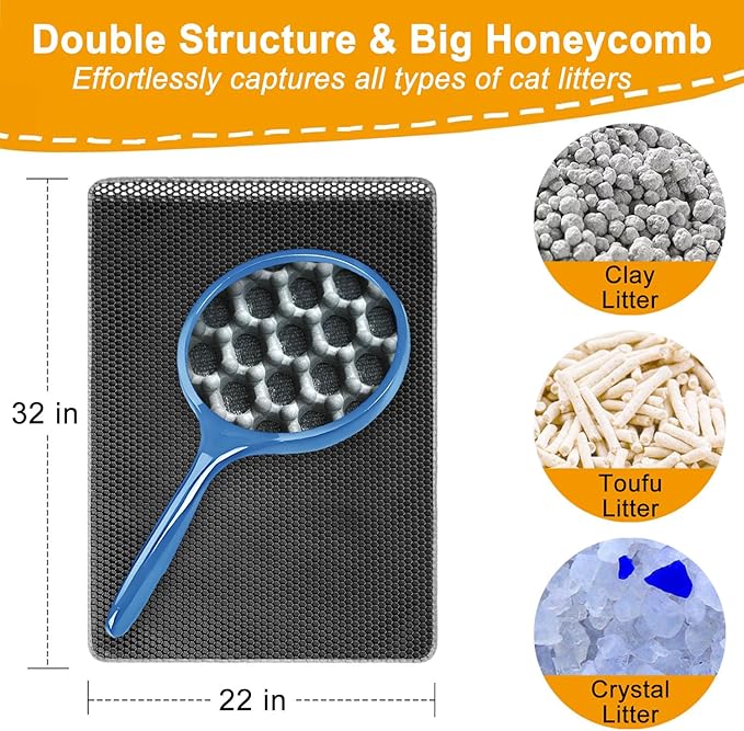 - Double Structure & Grid Design : Designed with black hole and dual structure, the cat litter box mat for floor is suitable for most litter. Once the litter on cat's paw drops, it is captured by the honeycomb cat litter mat and keeps the indoor environment clean by preventing it from spreading everywhere