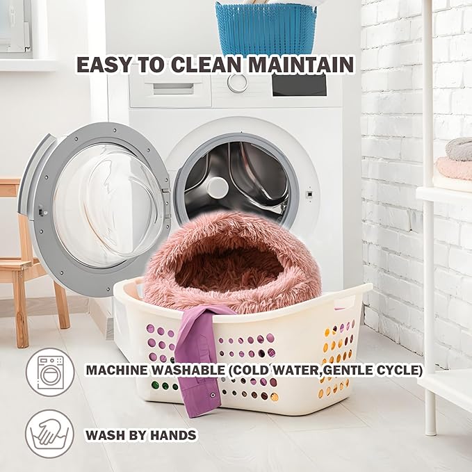 Cat Bed for Indoor Cats, Calming Cozy Cave with Self-Warming Plush, Entire Bed Machine Washable & Anti-Slip Base, Breathable Pet Bed for Small Cats&Dogs All Seasons (Leather Pink, 24*24inch)