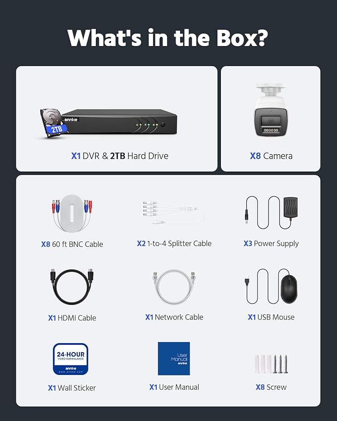 - Day/Night Security & IP67: Comes with 2TB pre-installed hard drive disk, this 8 camera system records longer time for 24*7 recording. Rates as IP67, it can endure harsh weather conditions for outdoor scenario, enjoying a longer life expectancy