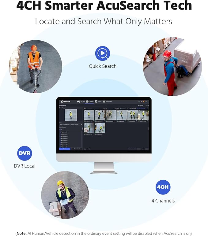 - Advanced AcuSearch Tech: With 4ch AcuSearch feature, you can locate and search what only matters with a click to save time and bring convenience. NOTE: AcuSearch is only for DVR local enabling. AI detection in the ordinary event setting will be disabled for all 8ch when the AcuSearch is enabled