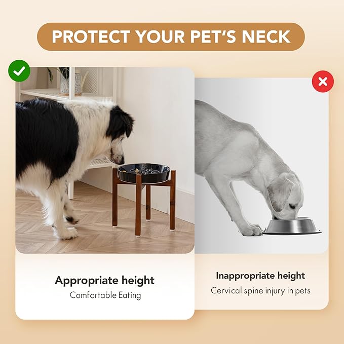 - Acacia Wood Stand: Adopting with classy acacia wood stand, this aesthetically pleasing ceramic dog bowls with stand fits perfectly with any home decor style. Raised ceramic dog bowls provide dogs with correct eating posture,improved reducing bloating and neck strain with dogs,and prevents indigestion problem.
