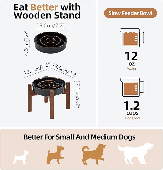Ceramic 1.2 Cup Raised Slow Feeder Dog Bowl Set, Elevated Acacia Wood Stand for Medium and Small Dog, 7.3inch Slow Dish, Stop Bloat(Single Bowl+ Stand, Starry Sky)