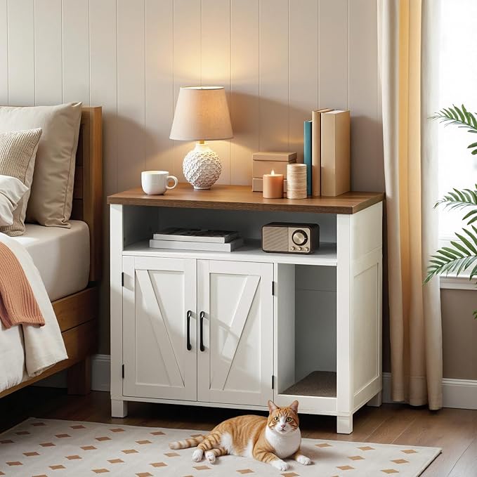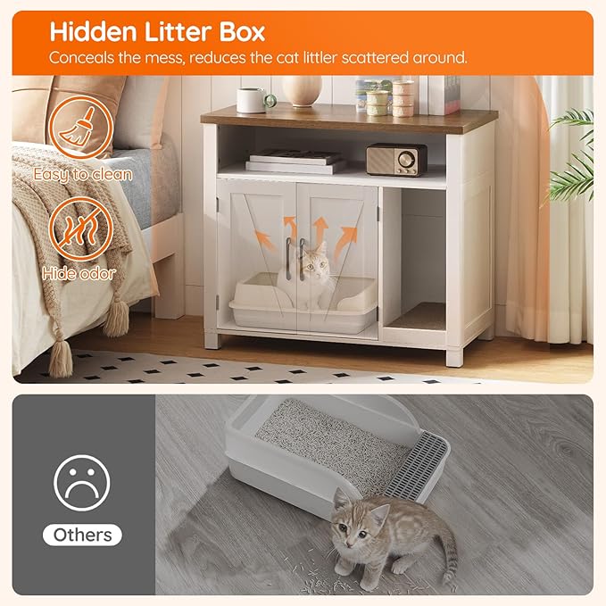 - Furniture-Style Design: The litter box enclosure combines white and walnut colors for a natural and warm farmhouse look. Its furniture-like appearance blends seamlessly into home decor, and the elevated design is easy to clean with no dead corners